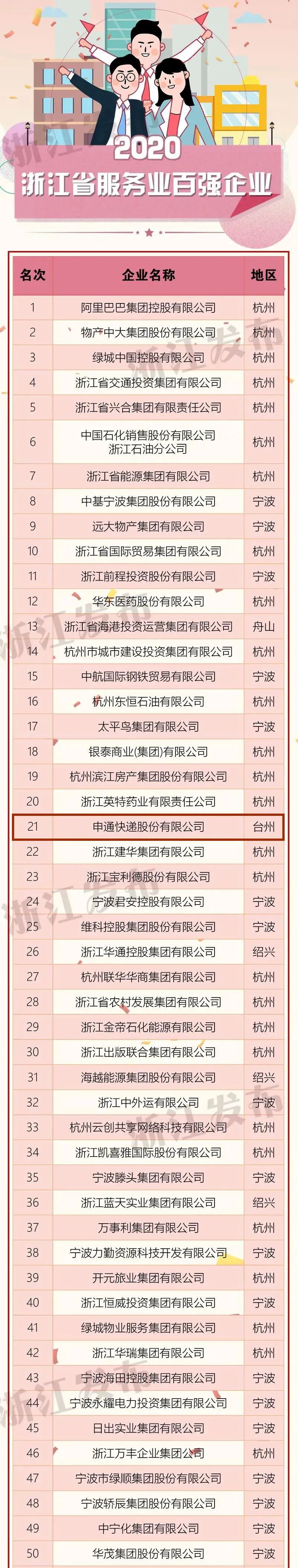 10月21日,浙江省企业联合会、省企业家协会、省工业经济联合会正式发布《2020浙江省百强企业》榜单,包括2020浙江省百强企业、2020浙江省制造业百强企业、2020浙江省服务业百强企业和2020浙江省成长性最快百强企业4个排行榜单。这是自2003年以来连续第十八次向社会公开发布年度浙江省百强企业榜。