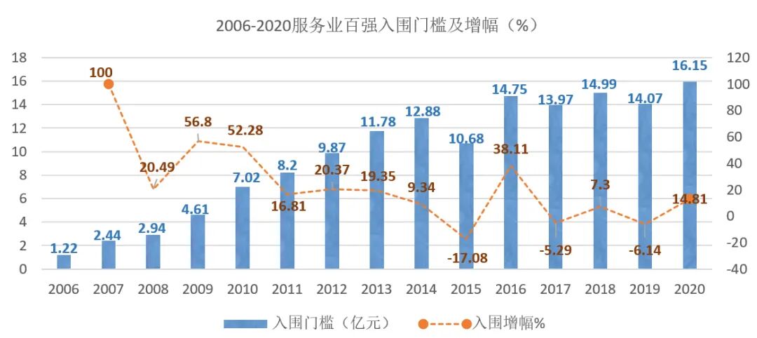 服务业百强企业今年换榜新增8家,入围门槛上升14.81%,营业收入增长15.35%、利润总额增长47.40%、资产总额增长32.01%。