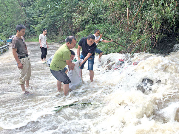 受台风“摩羯”影响,8月12日晚,白水洋镇黄坦山区山洪暴发。13日一大早,黄坦办事处机关干部为清黄线路面上的洪水进行疏通分流,清理沿线倒塌的树木、石块等,确保这条黄坦山区主动脉安全畅通。 杨叶灿摄